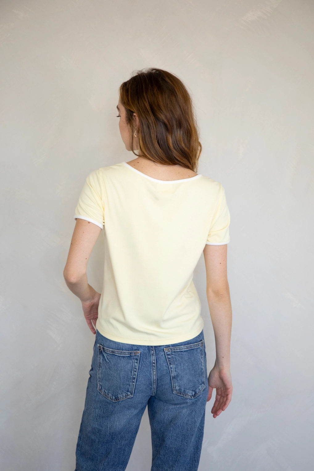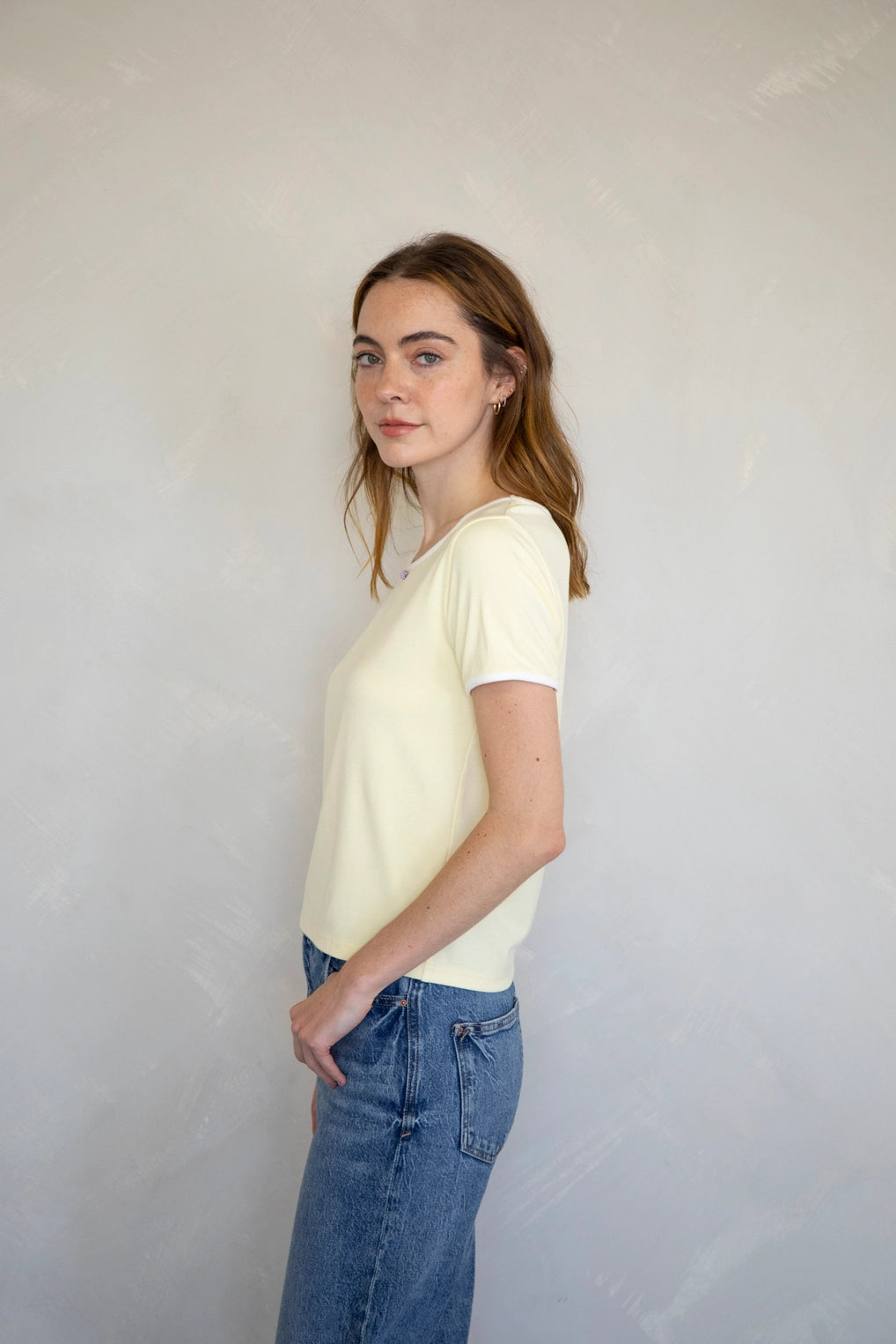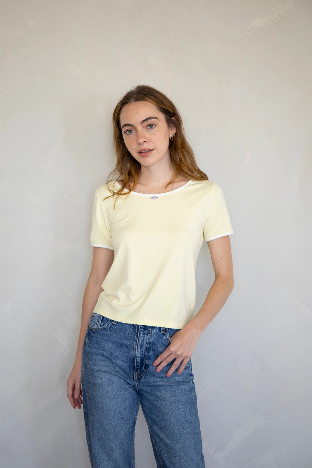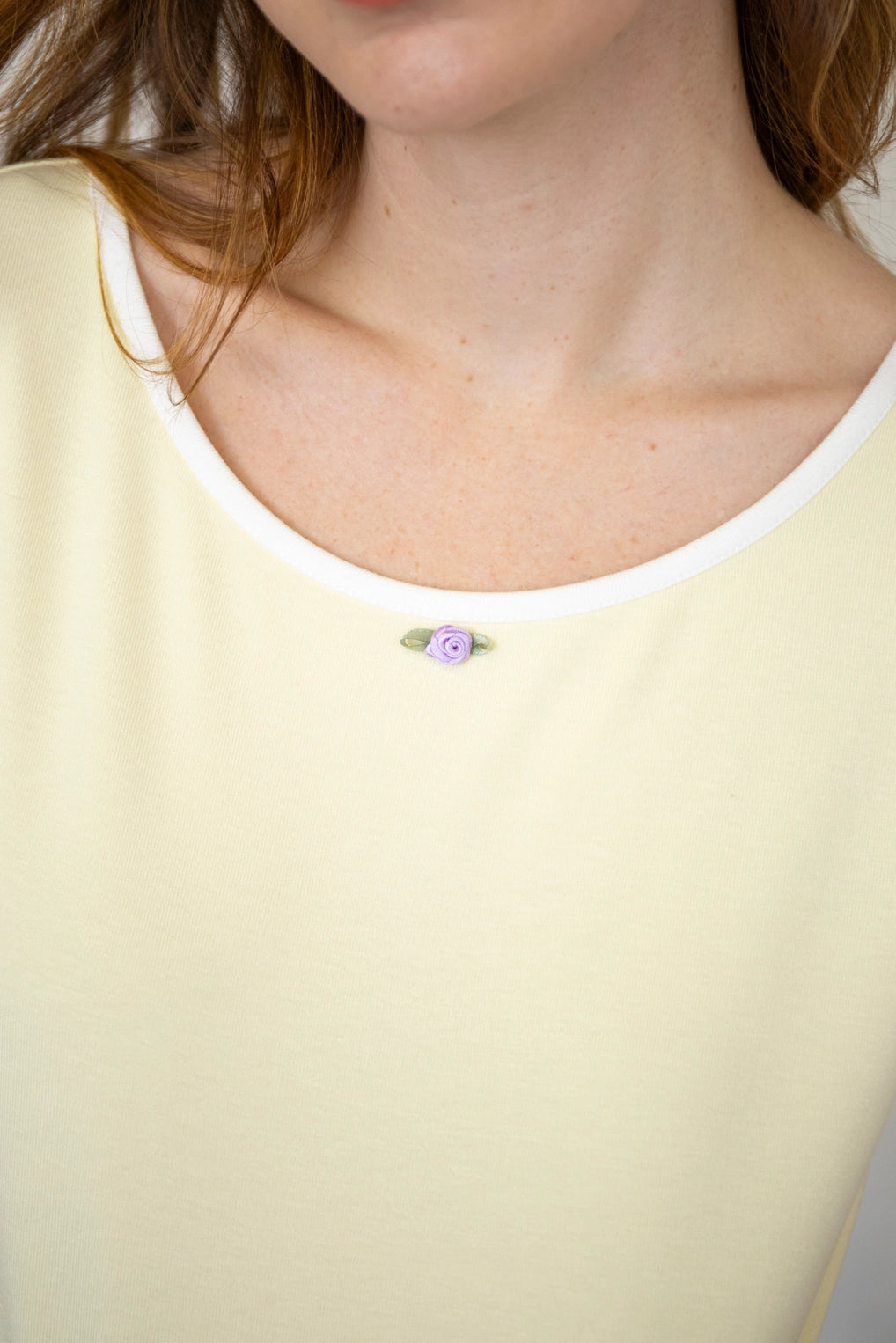 Contrast trim tee with rosebud detail.
