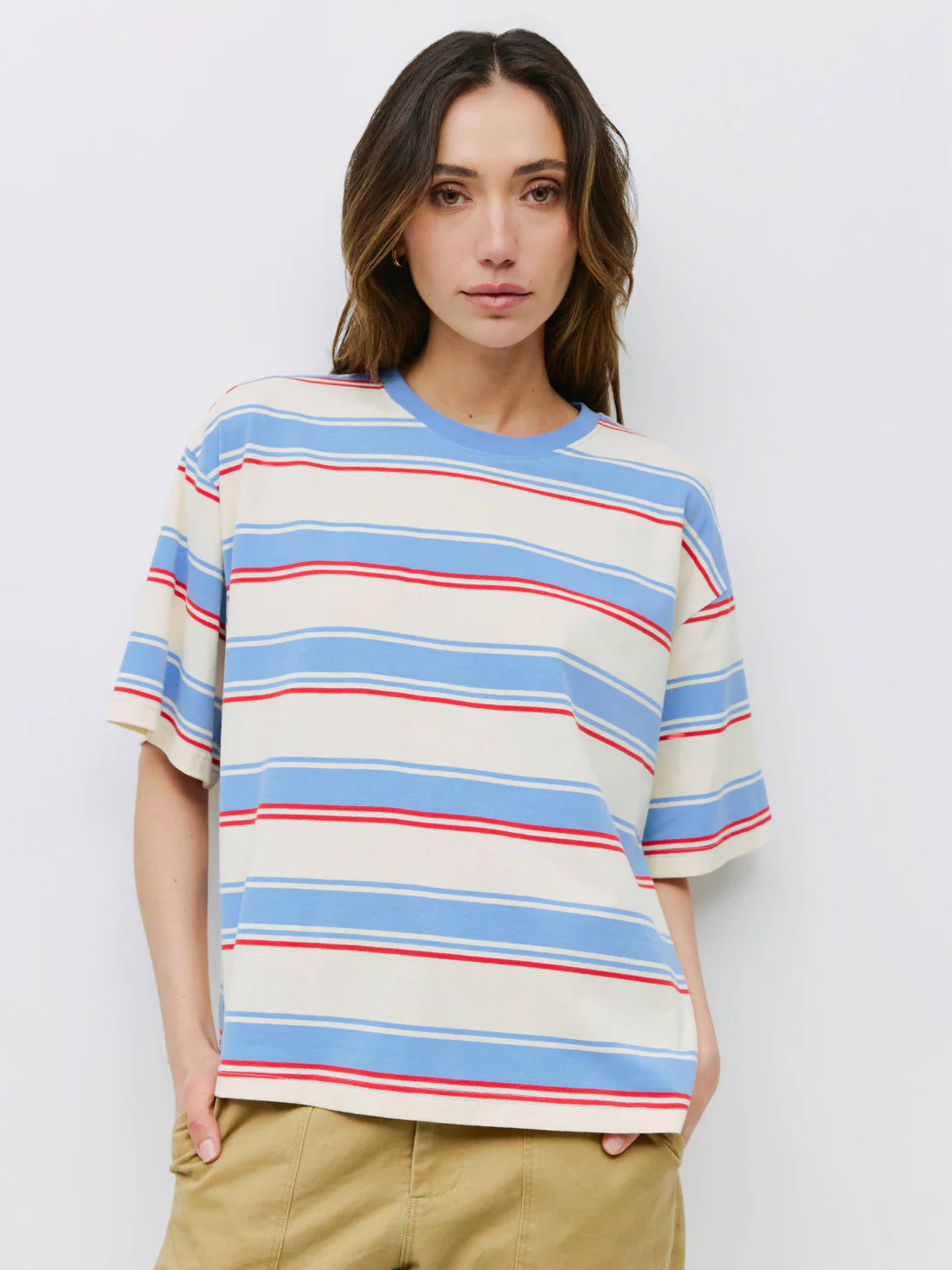 The Sunny Top is a relaxed striped t-shirt cut from a midweight knit with a soft, structured feel. Designed with elbow-length sleeves, a ribbed neckline, and a boxy fit for easy layering.